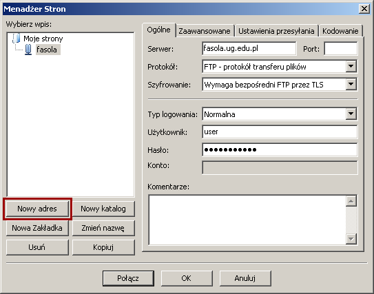 2. Klikamy na przycisk 'Nowy adres', opisujemy sesję jako fasola i w zakładce Ogólne wypełniamy rubryki: