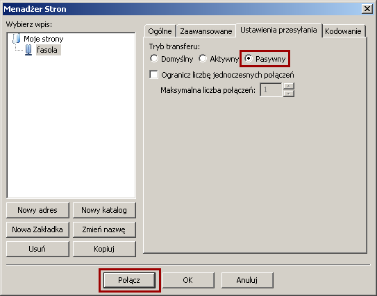 3. Przejdźmy do zakładki 'Ustawienia przesyłania' i wybieramy Tryb transferu: 'Pasywny'