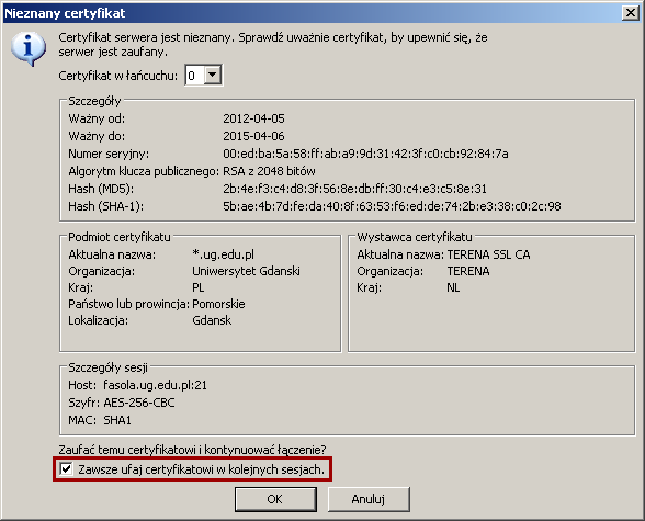 Zaznaczamy 'Zawsze ufaj certyfikatowi w kolejnych sesjach' i klikamy OK.
