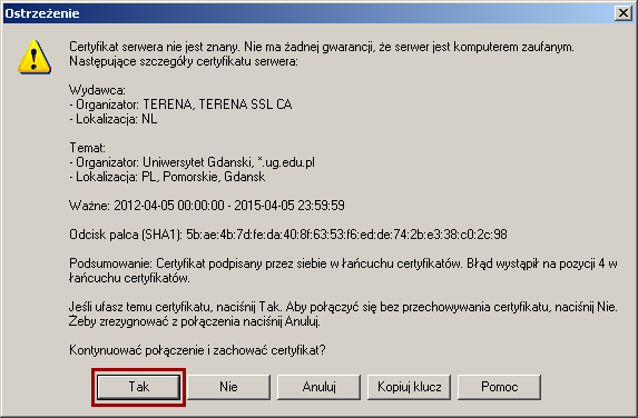 5. Przy pierwszym logowaniu pojawi się prośba o zaakceptowanie certyfikatu - klikamy Tak.